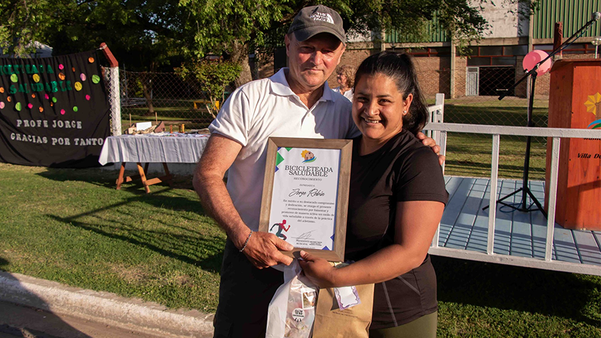 Al finalizar el recorrido, la tarde tomó un tono emocional, ya que se había preparado una sorpresa: un homenaje a la trayectoria del profesor Jorge Robín como docente y deportista. El exprofesor, visiblemente emocionado, recibió la visita de excolegas, amigos, docentes y familiares, quienes compartieron palabras conmovedoras que lo tocaron profundamente. Durante este emotivo momento, también recibió obsequios de parte de comerciantes locales y amigos,entre ellos Brian Neuman, el Sr. Secretario de Gobierno Rubén Rodríguez y familia, Figueroa Antonio entre otros. También recibió una ordenanza que lo declara Persona Destacada por el H.C.D., hizo entrega del documento la viceintendente Dra. Claudia Sánchez.